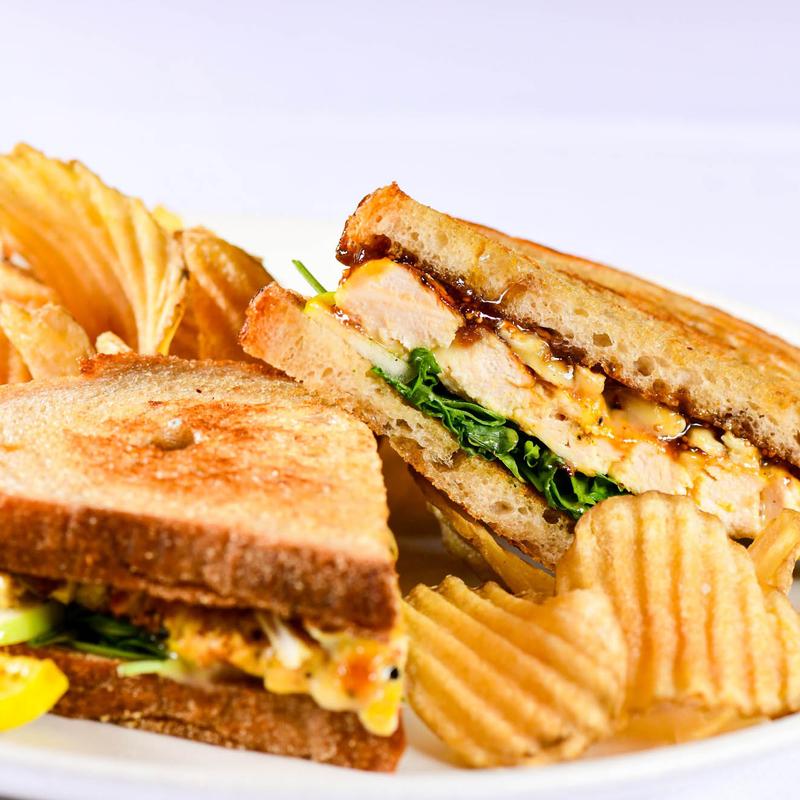 Grilled Red Bird Chicken paired with apple and brie cheese served on warm sourdough bread complemented by fig spread and fresh arugula, served with house potato chips
